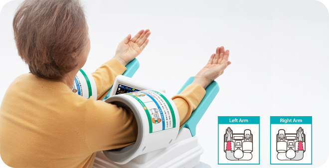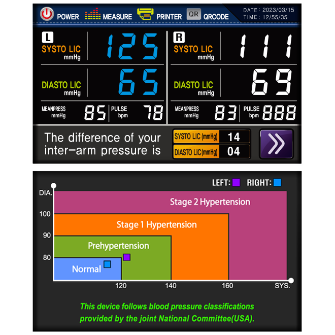 Používání je pohodlnější při zakoupení exkluzivního stolu pro tlakoměr spolu se židlí s nastavitelnou výškou. Při měření obou rukou se zobrazuje systolický a diastolický krevní tlak, průměrný krevní tlak a puls pravé a levé ruky a rozdíl mezi systolickým a diastolickým krevním tlakem pravé a levé ruky. Tlakoměr zobrazuje graf, který ukazuje, která úroveň odpovídá tabulce klasifikačních kritérií (JNC 7) krevního tlaku stanovené Společným národním výborem USA.
